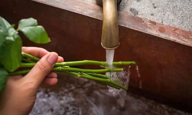 对一些容易脱水的花材,可将根部45度斜剪并开十字口,扩大根部吸水范围。剪切完根部后,可以用水将根部冲洗干净,使植物根部保持干净,以延长花的寿命。